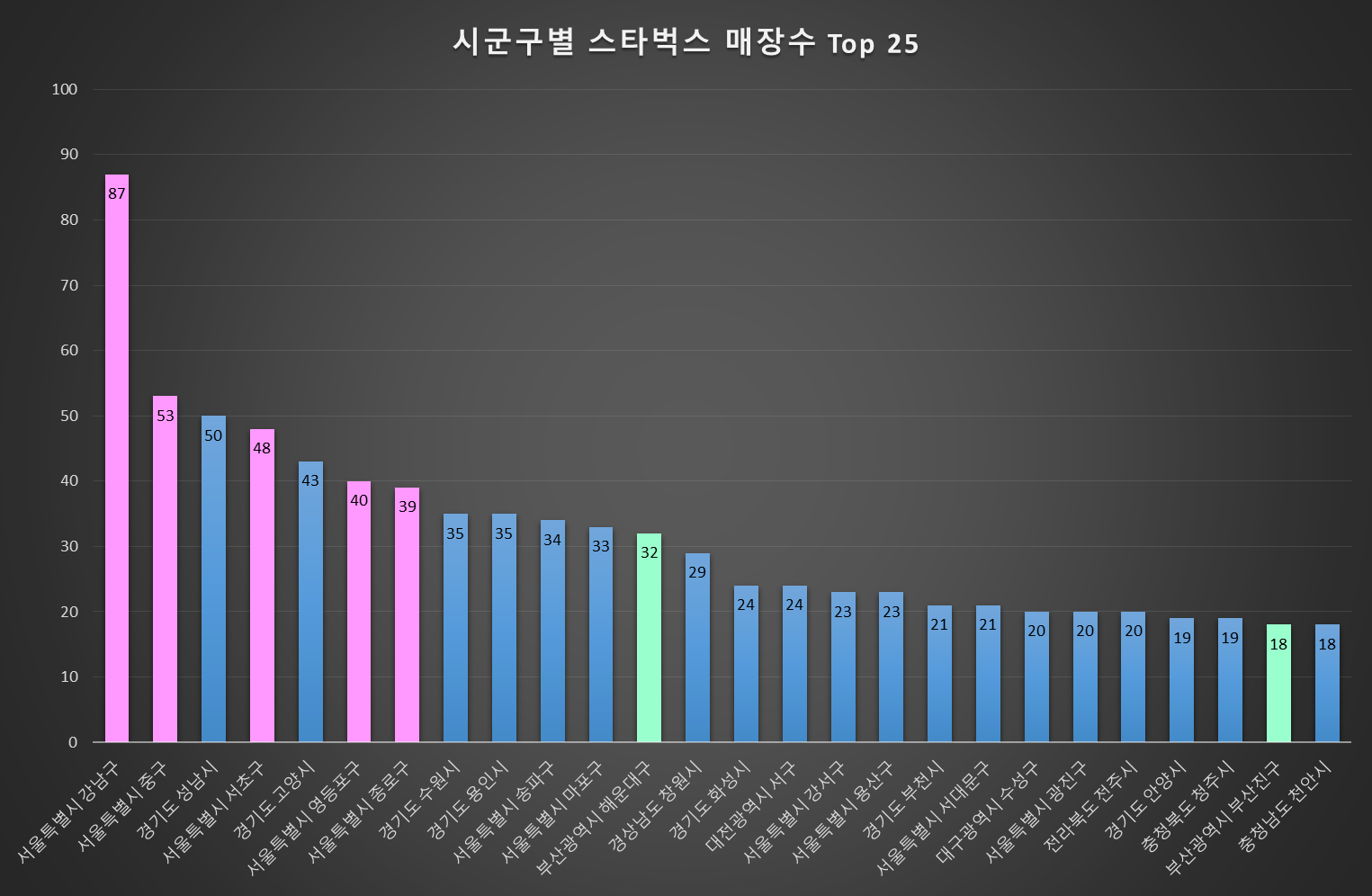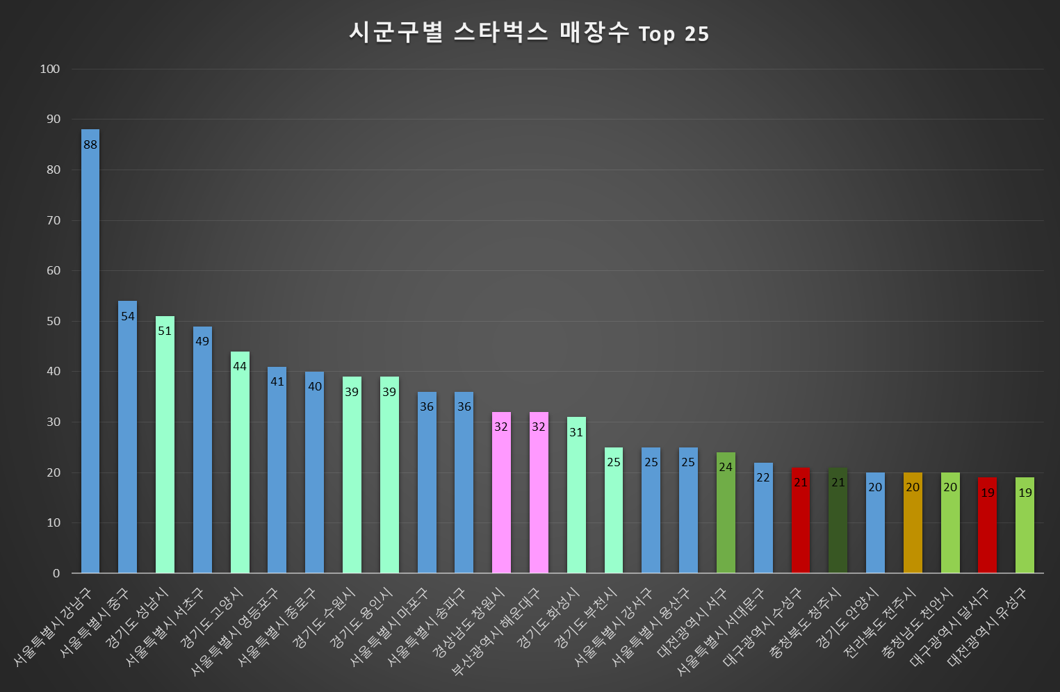 지역별로 색을 조금 달리 표현해 보았습니다. 제가 살고 있는 부산은 해운대구 한 곳이 명함을 간신히 내고 있네요. 제가 2019년 분석했을 때 부산진구(부산의 중심인 서면과 전포카페거리가 있는)가 상위권에 있었는데 보이지 않습니다.