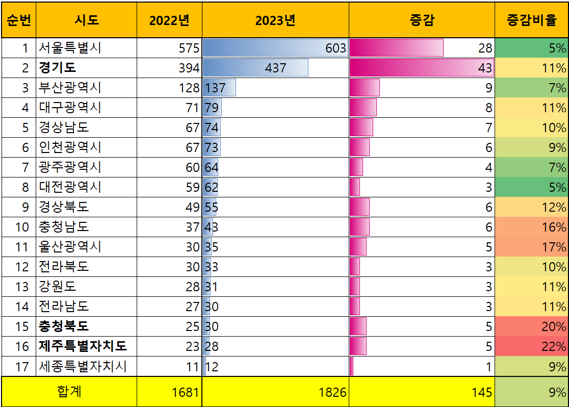 시도별로 22년과 비교해 보면 역시 전체적으로 증가하는 모습 중에서 유독 눈에 띄는 지역들이 있습니다.