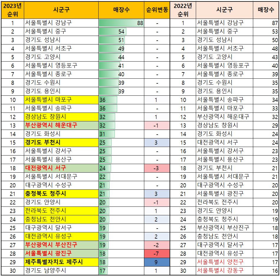 순위변화가 가장 높은 지역은 제주특별자치도입니다. 22년에 14개의 매장에 38위였는데, 23년에는 18개로 광진구와 같은 순위를 기록합니다. 그밖에 청주와 부천, 천안과 대전유성구의 경우도 순위가 상승했습니다.